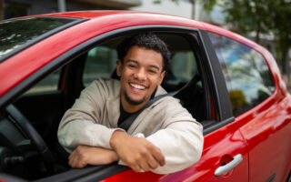 Young man leaning out of the driver’s seat window of a red car, smiling cheerfully