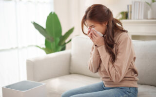 Young Asian woman sneezing into tissue while sitting on sofa next to air purifier, expressing allergy symptoms or illness in living room.