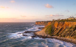 Long exposure shot of waves crashing into the tall cliffs along the Southern California coast at sunset on a windy day, Golden Cove, Rancho Palos Verdes, California