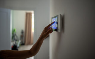 Closeup hand using smart home touch screen with connected appliances device on wall. Setting, checking energy security heating system on digital control in apartment. Home automation monitoring.