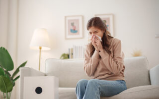 Young Asian woman sits on a couch, sneezing and holding a tissue to her nose while an air purifier operates nearby to improve air quality.